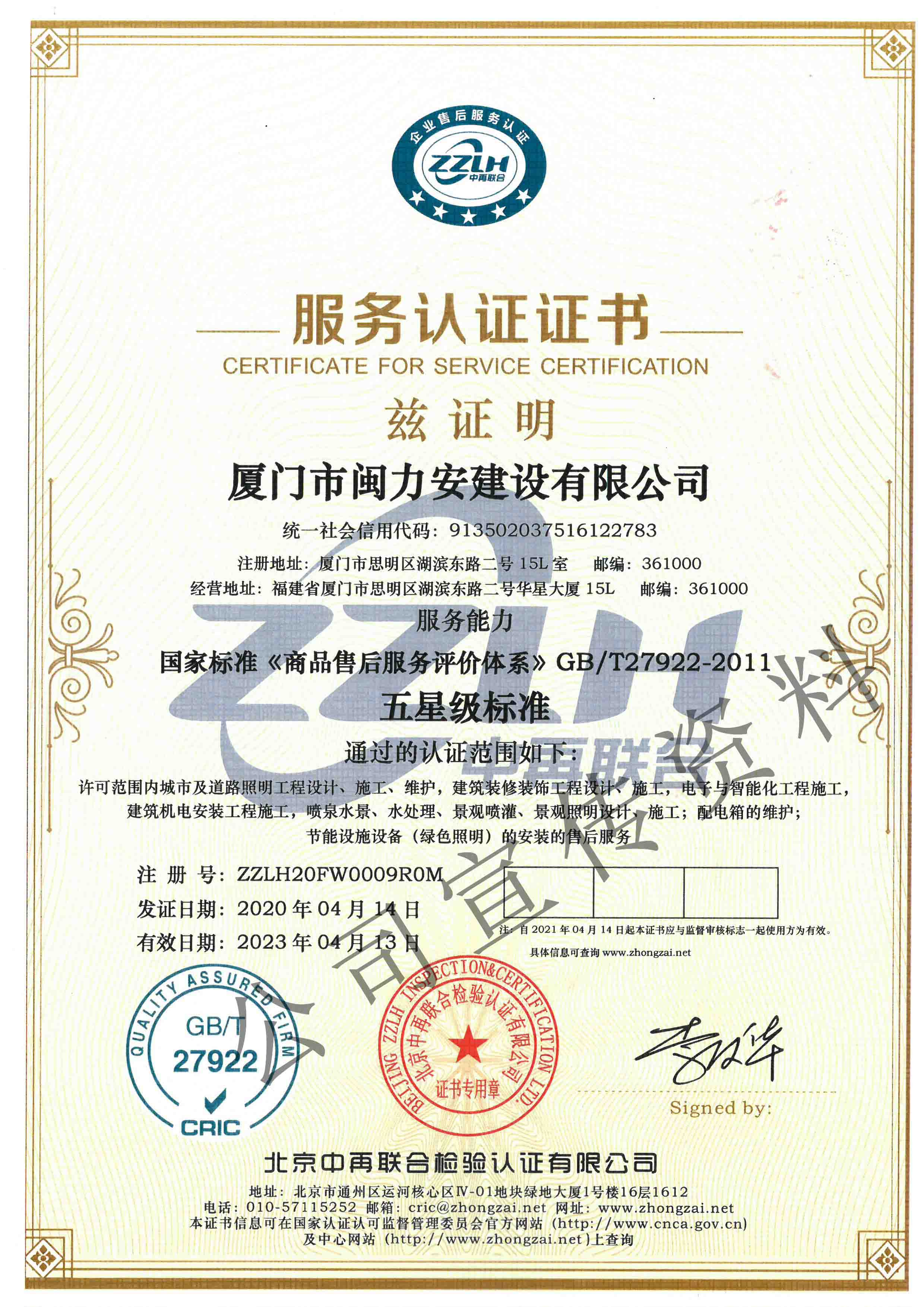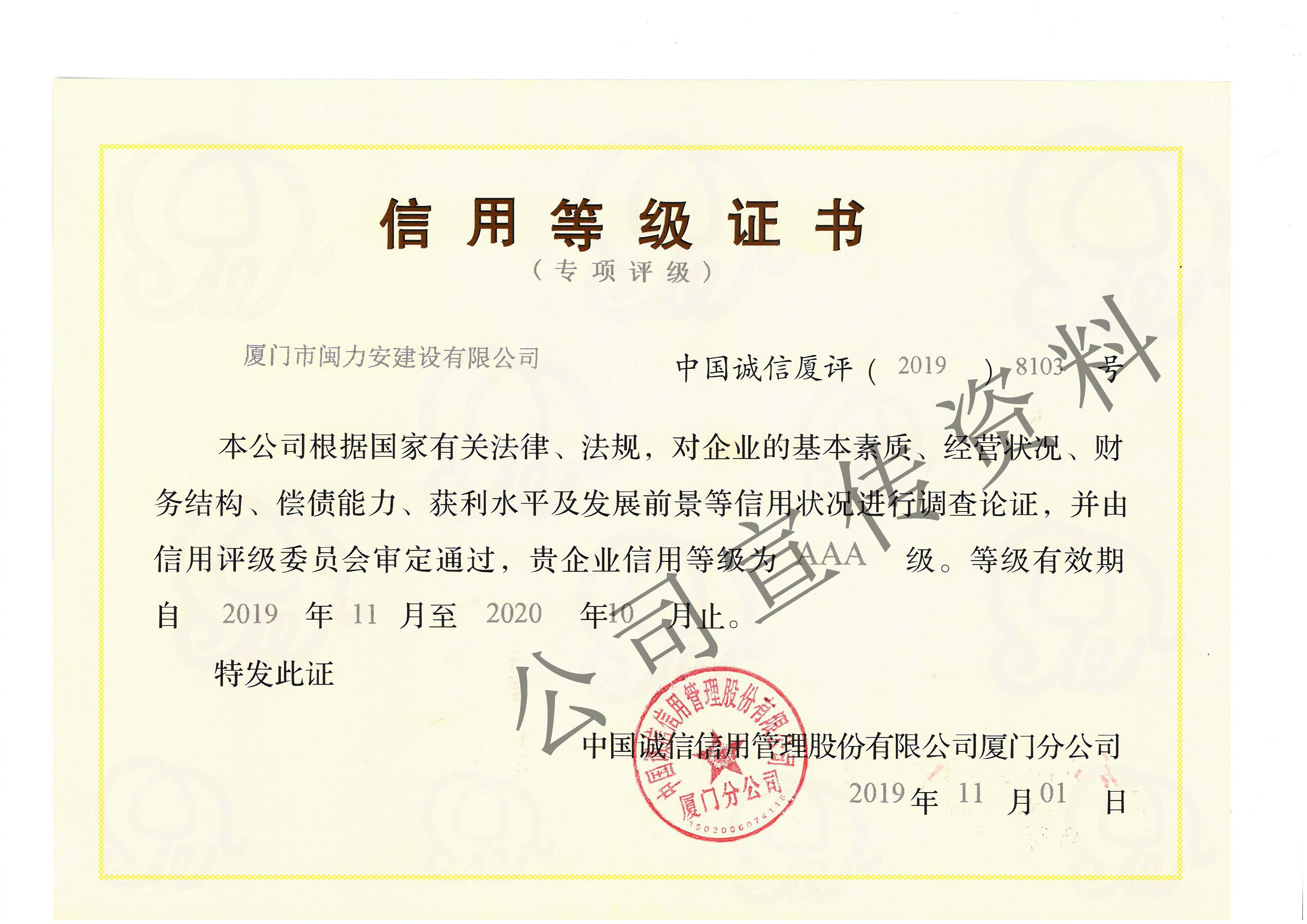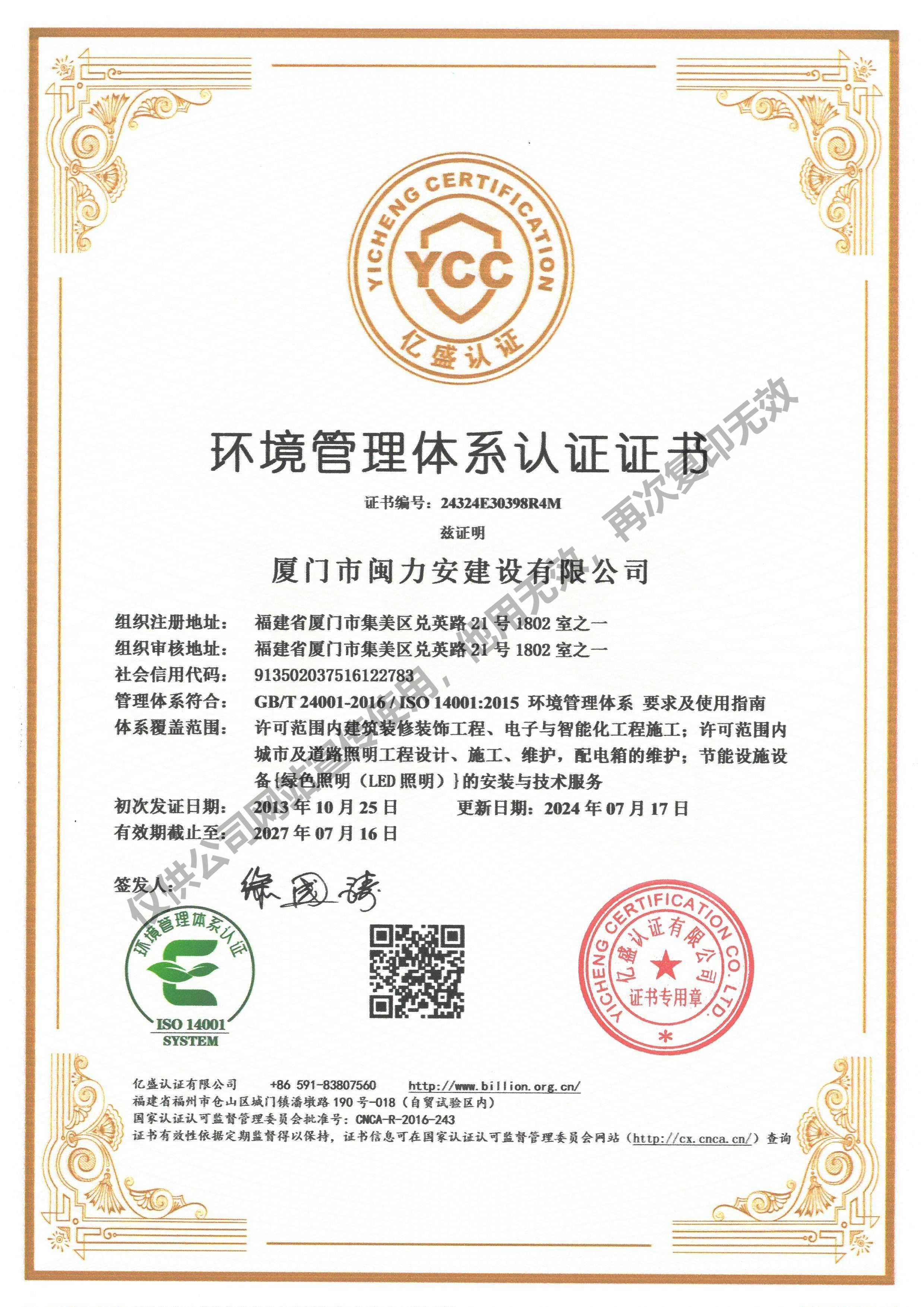 廈門市閩力安建設有限公司成立于2003年,公司取得市政公用工程施工總承包貳級、建筑裝修裝飾工程專業承包壹級、城市及道路照明工程專業承包壹級、電子與智能化工程專業承包貳級、消防設施工程專業承包貳級、電力工程施工總承包叁級、建筑機電安裝工程專業承包叁級、輸變電工程專業承包叁級、環保工程專業承包叁級、照明工程設計專項甲級、建筑裝飾工程設計乙級、施工勞務等資質的綜合型企業,公司于2013年通過了ISO9001質量體系認證,ISO14001環境管理體系認證,OHSAS18001職業健康安全管理體系認證。